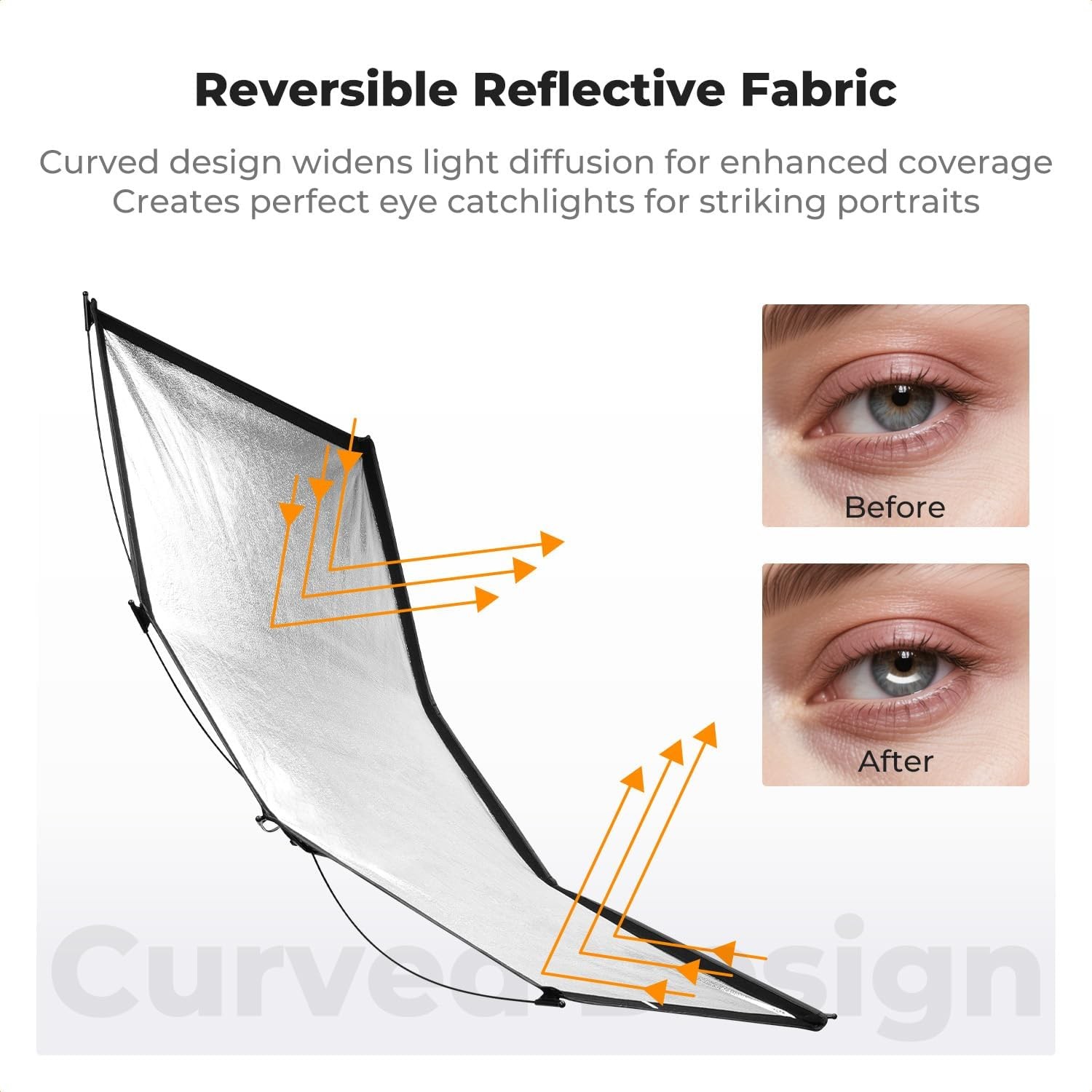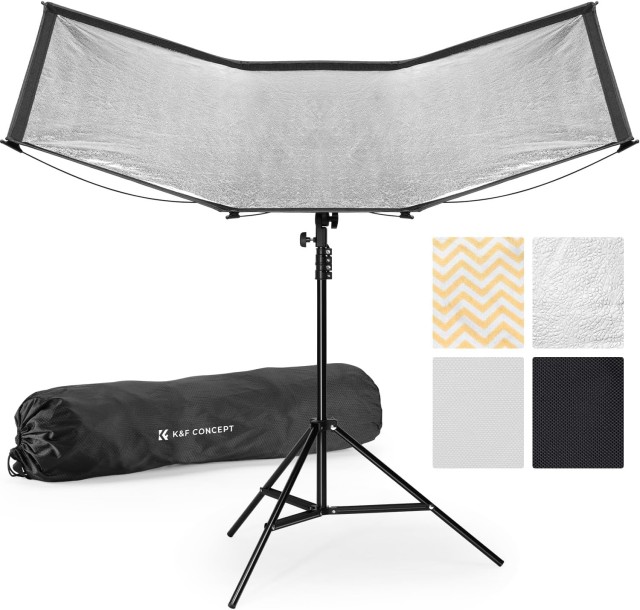 El reflector curvo de liberación rápida K&F CONCEPT es un reflector ligero y portátil de 123 × 65 cm, diseñado para proporcionar una luz suave y favorecedora. Gracias a sus cubiertas magnéticas 4 en 1, su base ajustable en un ángulo de 180° y su fijación rápida, es ideal para retratos al aire libre, sesiones fotográficas en exteriores y reflejos de calidad profesional en los ojos.