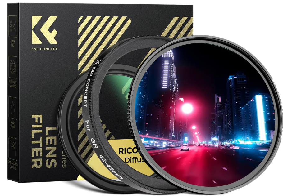 El kit de filtros K&F Concept Black Diffusion 1/4 + MCUV Protection Filter Kit con adaptador de 42–49 mm es una combinación especialmente diseñada de dos filtros para las cámaras compactas Ricoh GR IIIx, GR IIIx HDF, GR III, GR III HDF y GR II, que aúna la protección esencial contra los rayos UV con los efectos cinematográficos de la difusión negra. El filtro UV multicapa bloquea los rayos ultravioleta para reducir los tonos azulados y proteger contra el polvo y los arañazos, mientras que el filtro difusor 1/4 suaviza las imperfecciones de la piel, añade reflejos de ensueño y reduce el contraste para lograr un brillo cinematográfico y favorecedor, todo ello en un marco ultradelgado de 1,8 mm de cristal AGC de primera calidad, que garantiza una alta transmisión sin viñeteado.