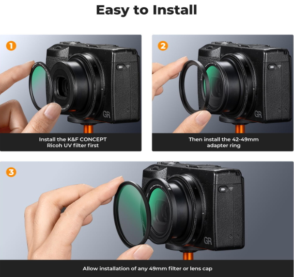 K&F CONCEPT Ricoh lens filter adapter ring 42-49mm, equipped with X series UV, X series black soft 1