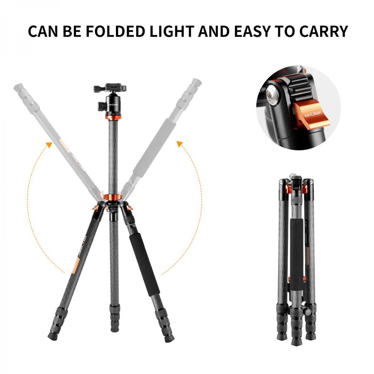 - 【Material de alta calidad: fibra de carbono】El trípode para cámara K&F Concept D284C2+BH-28 está fabricado con fibra de carbono de alta calidad, lo que garantiza un soporte más sólido, mayor resistencia a las inclemencias del tiempo, a la corrosión y a los arañazos, y, en general, mayor solidez que el aluminio. Este trípode de fibra de carbono pesa solo 3,77 kg, mide 19,3"/490 mm de largo cuando está plegado, es extremadamente ligero y compacto, con una capacidad de carga de hasta 22 kg / 10 kg, por lo que es ideal para fotografiar tanto en interiores como en exteriores.