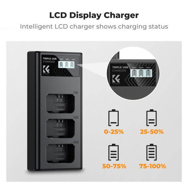 Tanto si capturas momentos en el estudio como en una expedición al aire libre, el cargador K&F Concept garantiza que tus baterías permanezcan cargadas y listas para usar.
