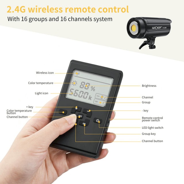 Con un CRI de 95 y un TLCI de 95+, el ST-150W garantiza tonos de piel naturales y una reproducción precisa del color. El brillo se puede ajustar de forma continua entre el 10 % y el 100 % mediante el controlador trasero o el mando a distancia inalámbrico incluido. La pantalla LCD grande y clara muestra el porcentaje de brillo, el canal y la configuración de grupo, lo que permite agrupar y controlar varias luces a la vez.