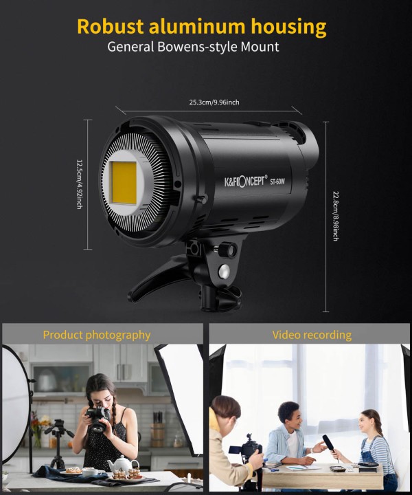 El ST-60W cuenta con una resistente carcasa de aleación de aluminio y está equipado con un eficaz sistema de disipación de calor con un ventilador silencioso, lo que lo hace adecuado para entornos sensibles al ruido. Su tamaño compacto, su diseño ligero y su rendimiento fiable lo convierten en una excelente opción para los creadores que necesitan iluminación profesional cuando están de viaje.