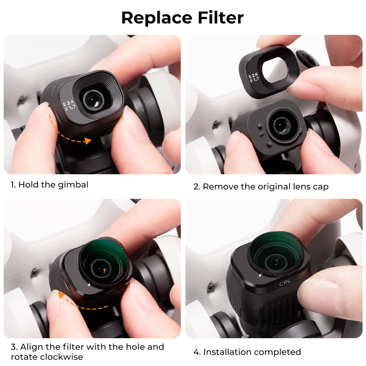 - * 【28 capas multicapa】El filtro multicapa reduce al máximo los reflejos y destellos, es resistente al agua, a los arañazos, al polvo y a la grasa, y protege el objetivo Mini 4 Pro de todas las influencias ambientales.