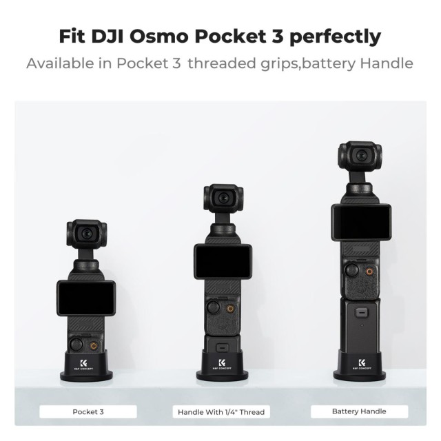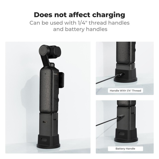 La base está diseñada para el Pocket3. Su amplia superficie inferior permite una colocación más estable sobre la mesa y evita que se caiga. Se adapta a la perfección. Diseñada específicamente para el Pocket3, permite su instalación en el cuerpo del dispositivo, con un mango roscado y un mango resistente, y es compatible con la funda protectora original.