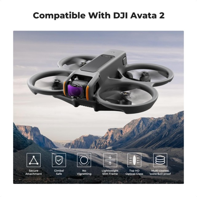 Este nuevo juego de 4 filtros ND de K&F Concept está especialmente diseñado para el DJI Avata 2 e incluye los filtros ND8, ND16, ND32 y ND64. Destaca por su peso ultraligero, garantiza la seguridad del cardán de tu dron y está fabricado con cristal óptico de primera calidad, lo que ayuda a reproducir imágenes sin concesiones, por lo que es un valioso complemento para tu kit de herramientas para droneshot.