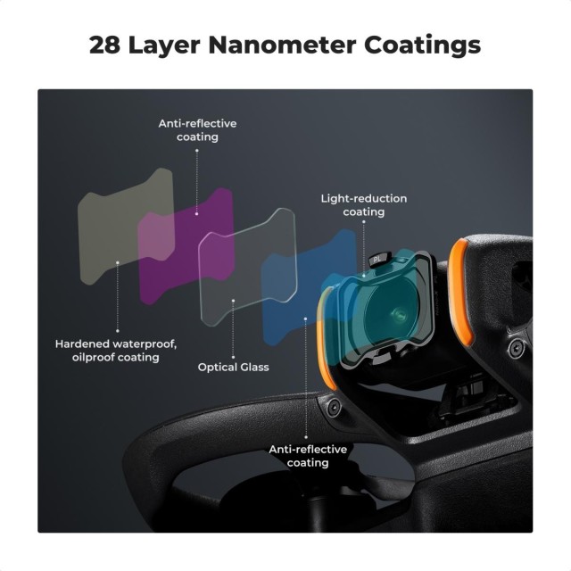 - * 【28 capas de cristal óptico multicapa】 Cada filtro está fabricado con cristal óptico AGC importado, sin afectar a la calidad de la imagen, y garantiza la reproducción fiel de los colores reales. Ambas caras del cristal cuentan con un tratamiento multicapa que ayuda a repeler el agua, el polvo y la grasa, y evita los arañazos. Es fácil de limpiar y mantener, y protege la lente de la Avata 2 de la suciedad omnipresente.