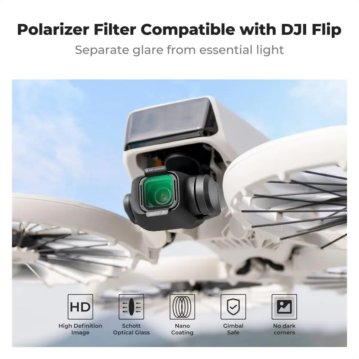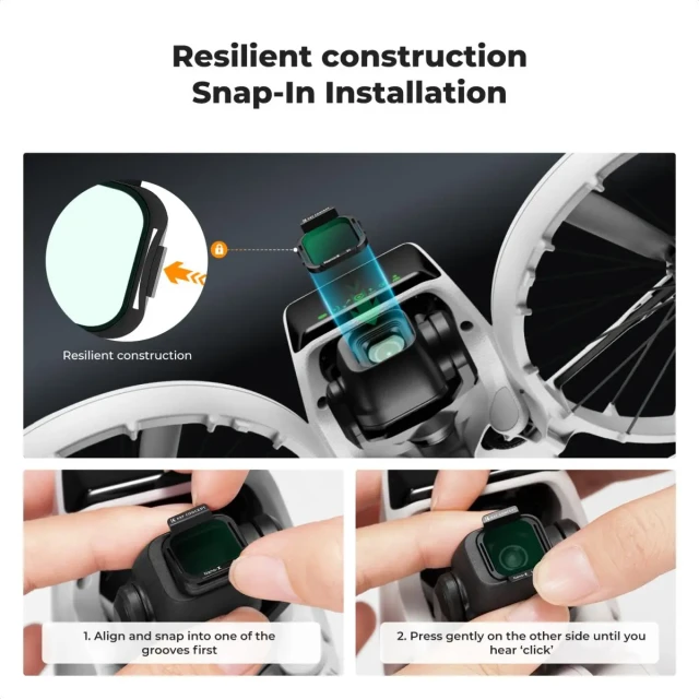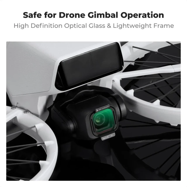 Este filtro PL de K&F Concept está diseñado para ser compatible con el sistema de cámara DJI Flip 4K UHD. Cuenta con un cierre a presión que se ajusta perfectamente a la base del objetivo de la cámara y es fácil de colocar y quitar.