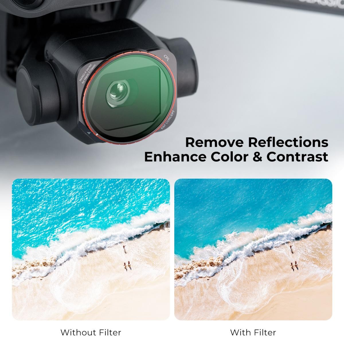 El filtro CPL de K&F Concept, diseñado específicamente para el DJI Mavic 3 Classic, ayuda a los fotógrafos y videógrafos aéreos a capturar colores más intensos y detalles más nítidos, ya que reduce eficazmente los reflejos de superficies no metálicas, como el agua, el cristal y el follaje. El efecto de polarización circular aumenta el contraste, intensifica el azul del cielo y mejora la saturación general del color sin introducir tintes de color.