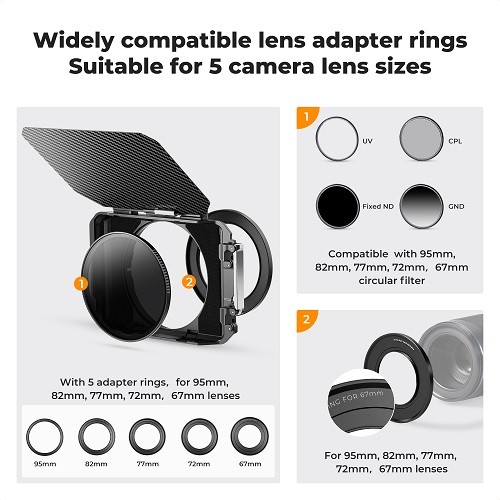 • Compatible con dos filtros cuadrados de 4 × 5,65″ para un control creativo versátil