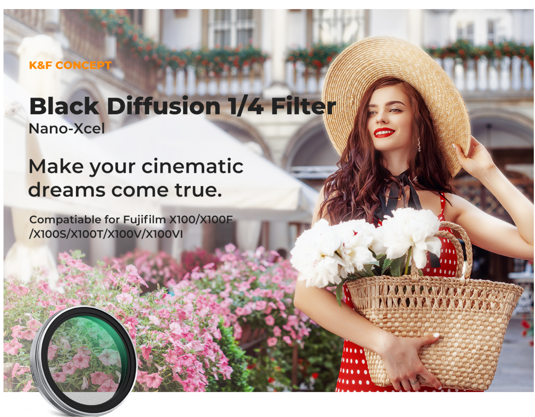 Compatible con las cámaras Fujifilm X100/X100F/X100S/X100T/X100V/X100VI. El filtro difuminador profesional negro de 1/4 de pulgada aporta a las imágenes un efecto halo suave y onírico, al tiempo que reduce el contraste y la nitidez al fotografiar. Suaviza la textura de la piel, reduce las imperfecciones y aporta a los tonos de la piel un aspecto más suave y natural.