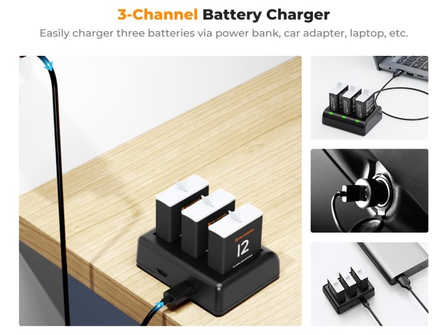• * Cargador LED de tres canales. Cargador LED portátil y fácil de usar de 3 canales para baterías GoPro Hero 9/10/11/12, que puede cargar 3 baterías individualmente o al mismo tiempo. Cada canal cuenta con un indicador luminoso.