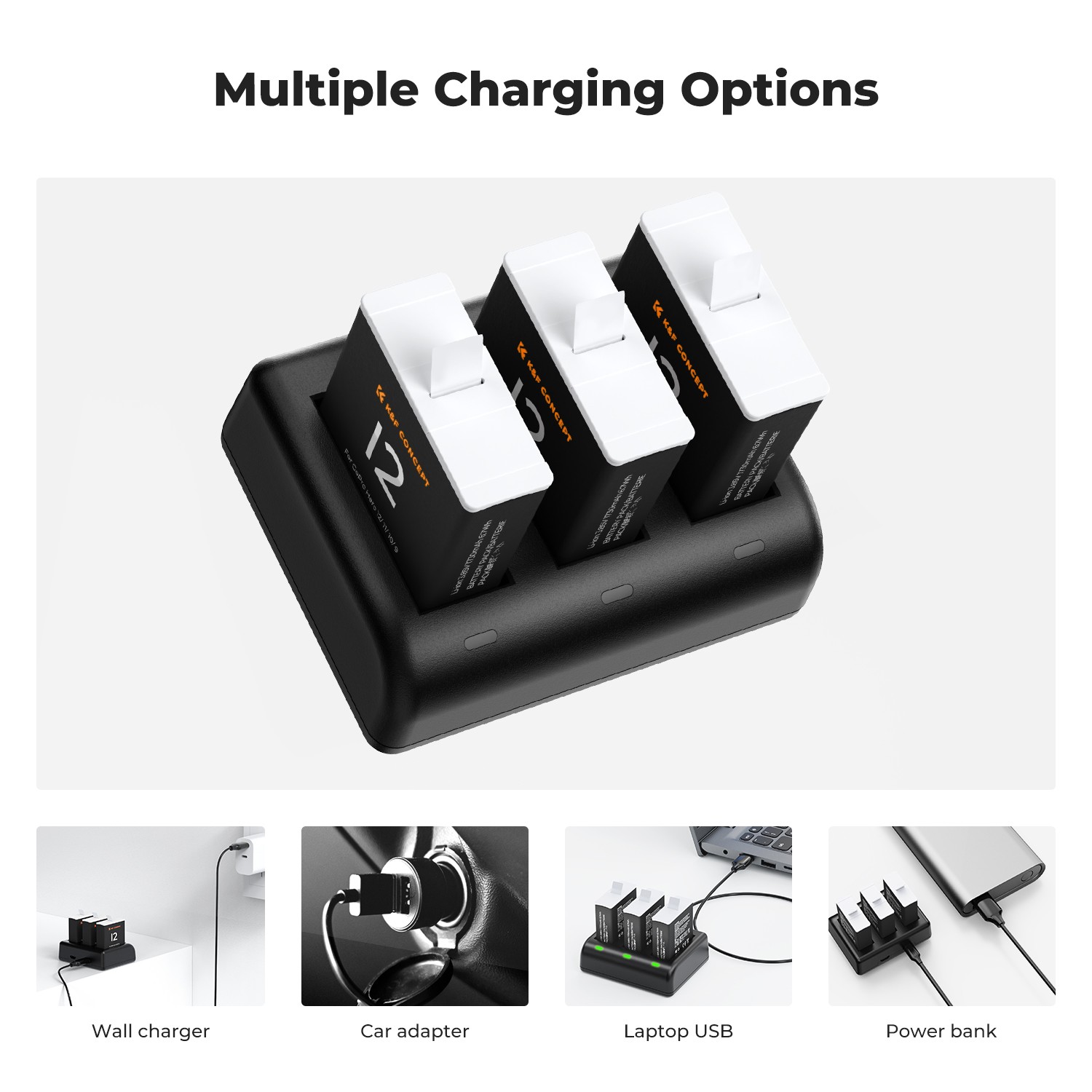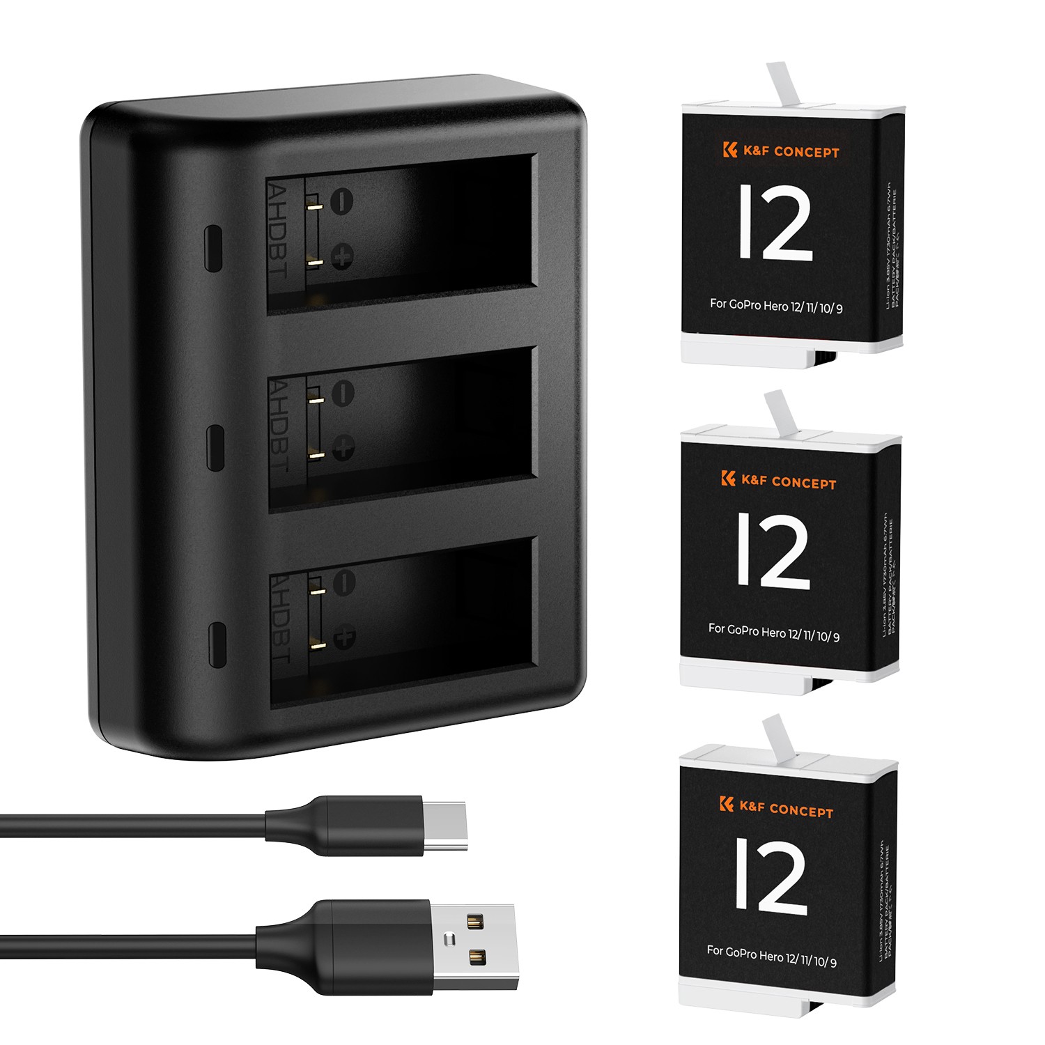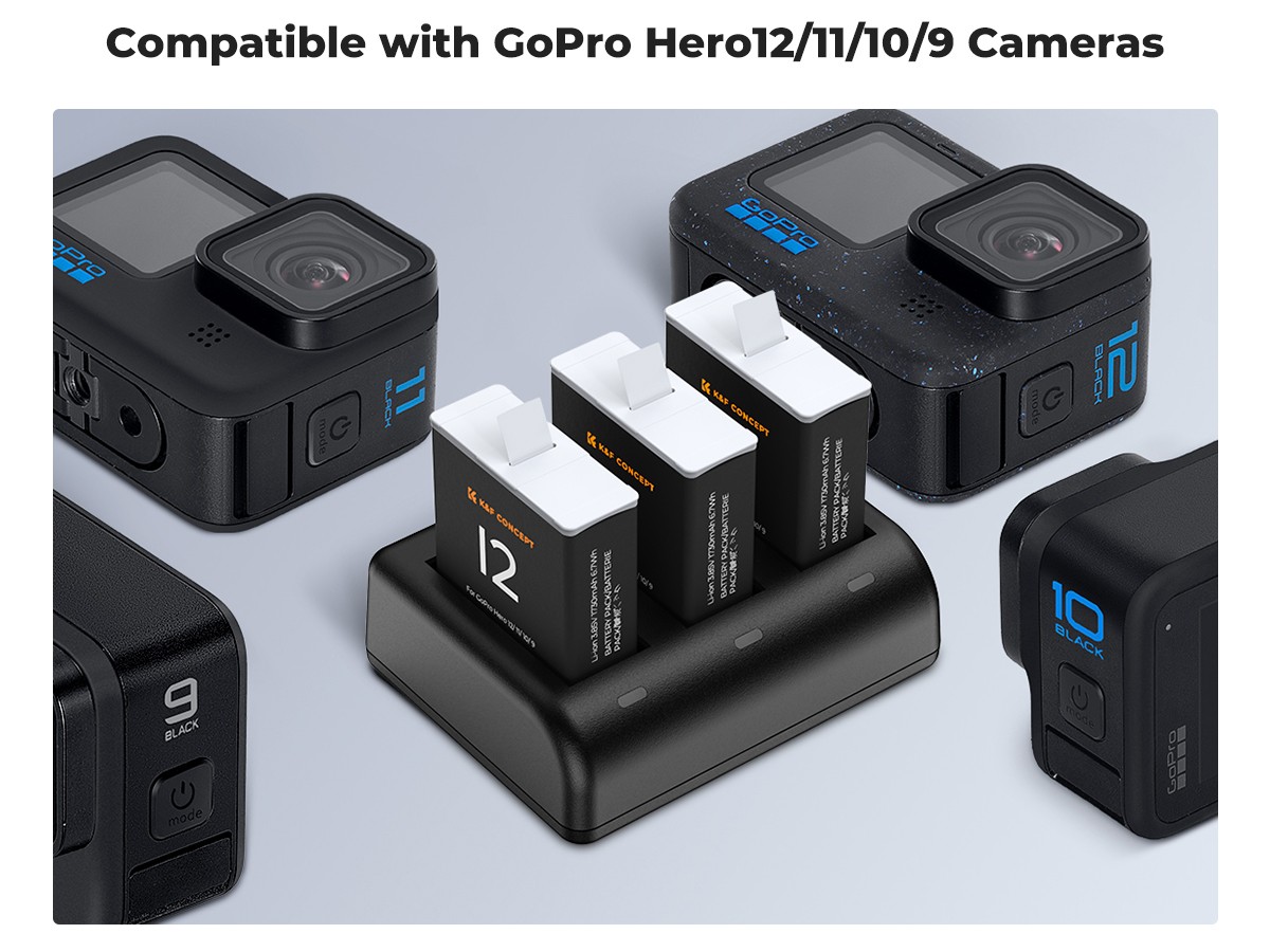 • K&F Concept Hero 12 Battery 3-Pack 1730mAh Enduro Batteries with 3-Slot Charger Compatible with GoPro Hero 12, GoPro Hero 11, GoPro Hero 10, GoPro Hero 9 Black Camera