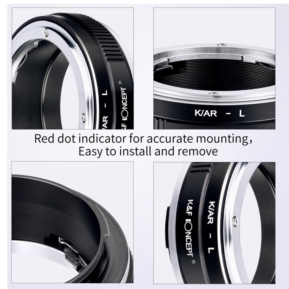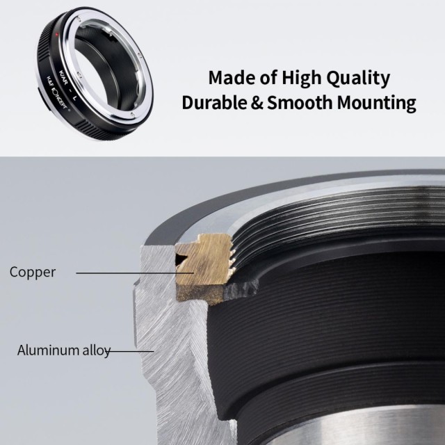 El adaptador de objetivo de alta precisión K&F K/AR-L permite a los fotógrafos combinar objetivos clásicos con montura Konica AR con modernas cámaras con montura Leica L. Este adaptador está fabricado en cobre y aleación de aluminio de alta calidad y ofrece una excelente resistencia, un alineamiento preciso y un ajuste suave sin aflojamientos durante el uso.