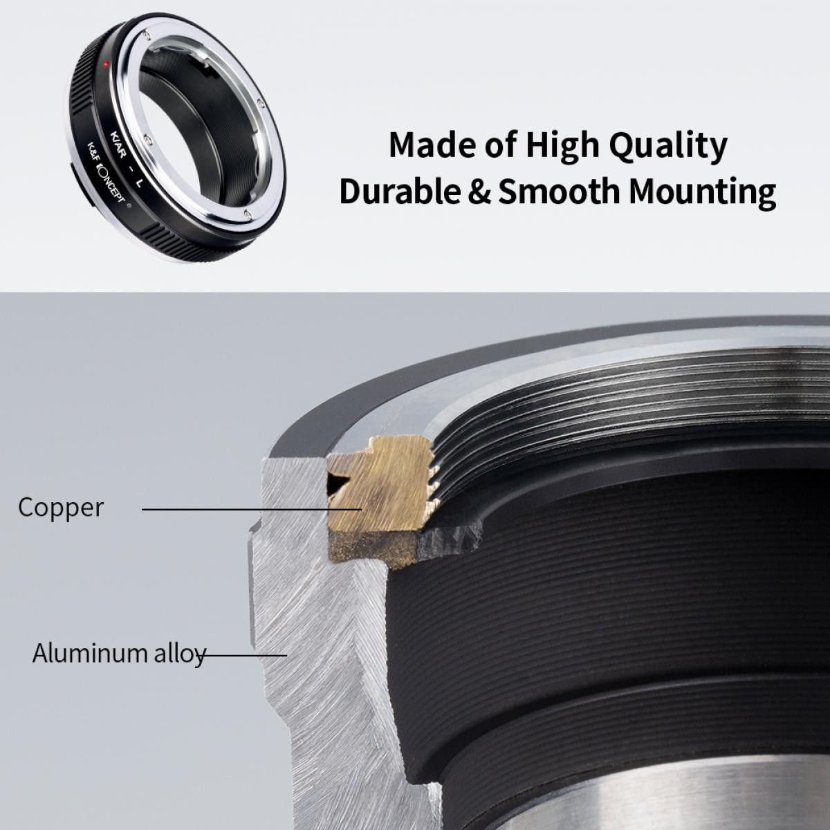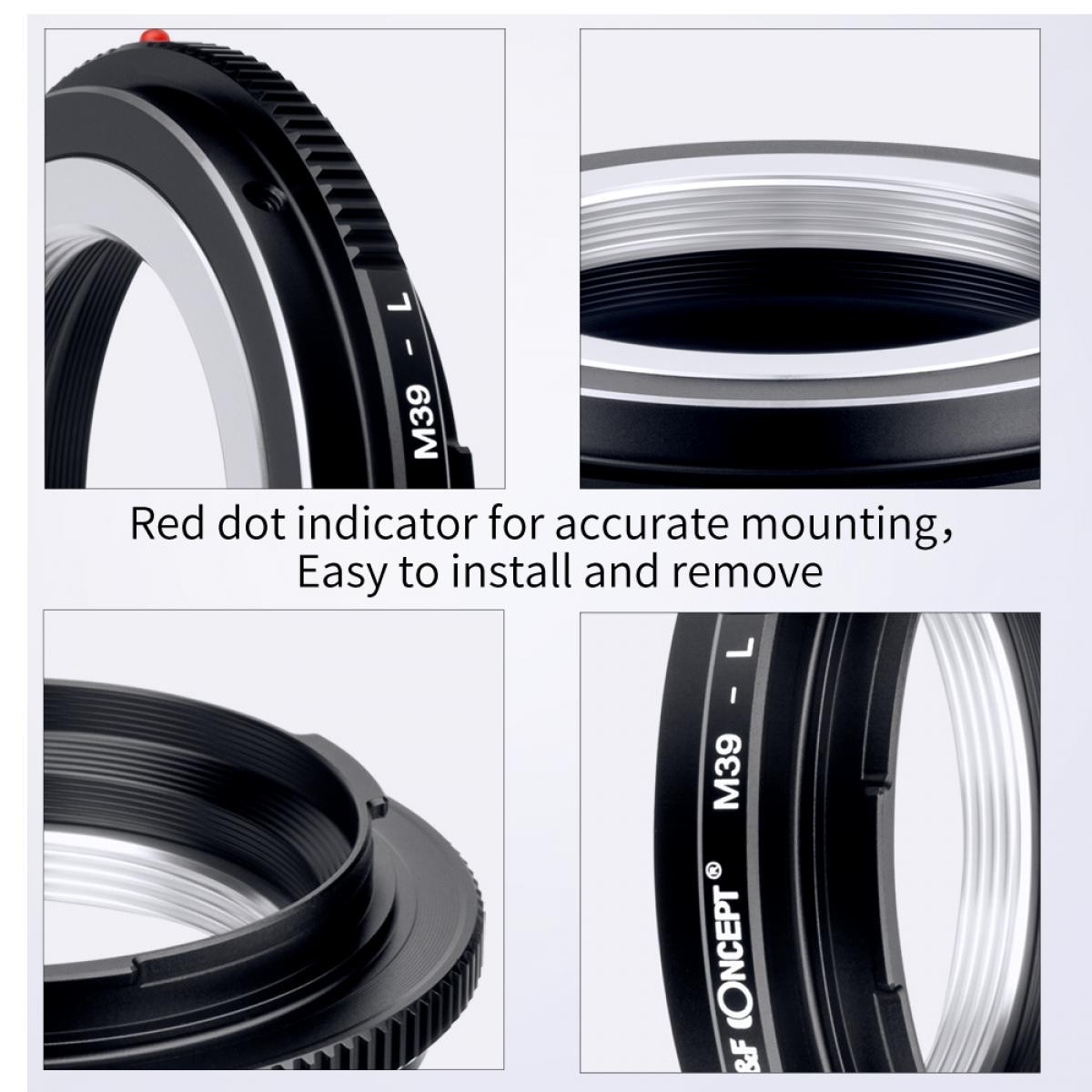 El adaptador de objetivo de alta precisión K&F M39 a L-Mount permite utilizar objetivos con montura Leica M39 en cámaras sin espejo con montura L-Mount. Está fabricado en cobre y aleación de aluminio de alta calidad y destaca por su alineación precisa, su montaje fluido, su control totalmente manual y su anillo de diafragma ajustable.