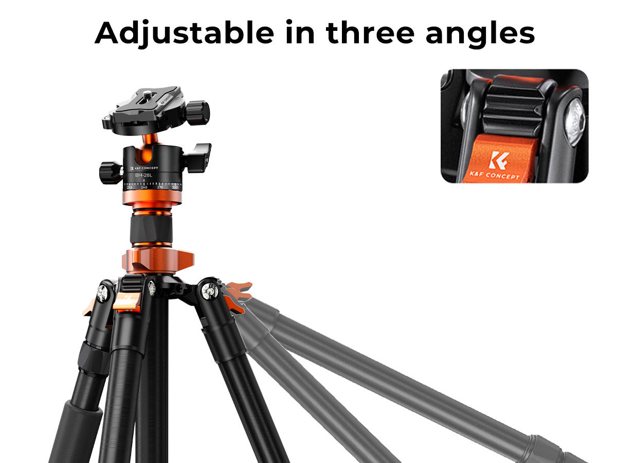 * 【TOMA MULTANGULAR】 Botón de resorte autoblocante para ajustar el ángulo del tubo de las patas; basta con pulsar y soltar para ajustar rápidamente el ángulo de apertura y cierre de las tres patas; puede ayudarte a conseguir tomas desde el ángulo más bajo, fotografías macro y otras fotos especiales mediante el eje central invertido.