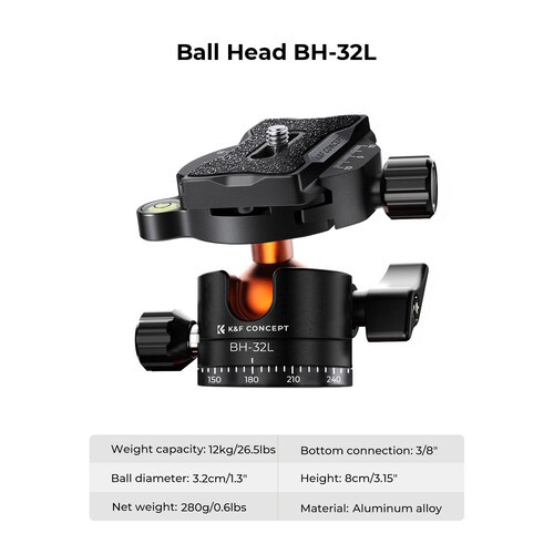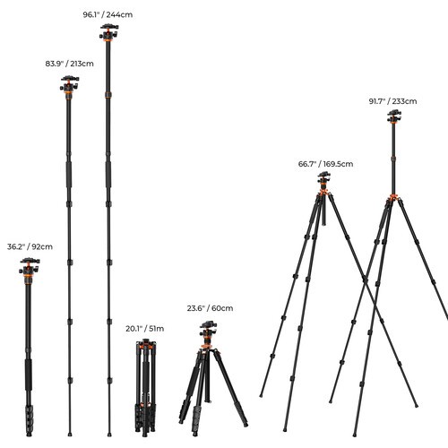 El trípode de aluminio K255A7 con rótula BH-32L de KF Concept es una solución compacta y versátil para montar una cámara. Pesa 1,85 kg y se puede plegar hasta una longitud de 51 cm, por lo que es fácil de transportar. Gracias a la estructura de aluminio de 5 secciones de las patas, se puede utilizar para fotografiar desde una altura de tan solo 60 cm hasta 233 cm, mientras que el diseño con bloqueo abatible garantiza la estabilidad incluso a la altura máxima. La rótula compatible con el sistema Arca facilita el ajuste preciso de la posición para la captura de la imagen, especialmente gracias al recorte de 90° para la fotografía vertical y a la base giratoria de 360°.