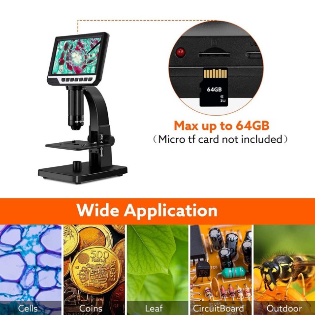 * Pantalla LCD IPS de 7 pulgadas: una gran pantalla de 7 pulgadas con alta resolución 1080p que muestra detalles magníficos e imágenes nítidas. El microscopio digital LCD cuenta con un amplio campo de visión y permite enfocar y acercar fácilmente el objeto deseado, lo que hace que la observación sea más intuitiva. Incorpora un diseño de pantalla giratoria (90 grados), lo que resulta más cómodo para el usuario a la hora de observar desde distintos ángulos;