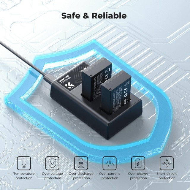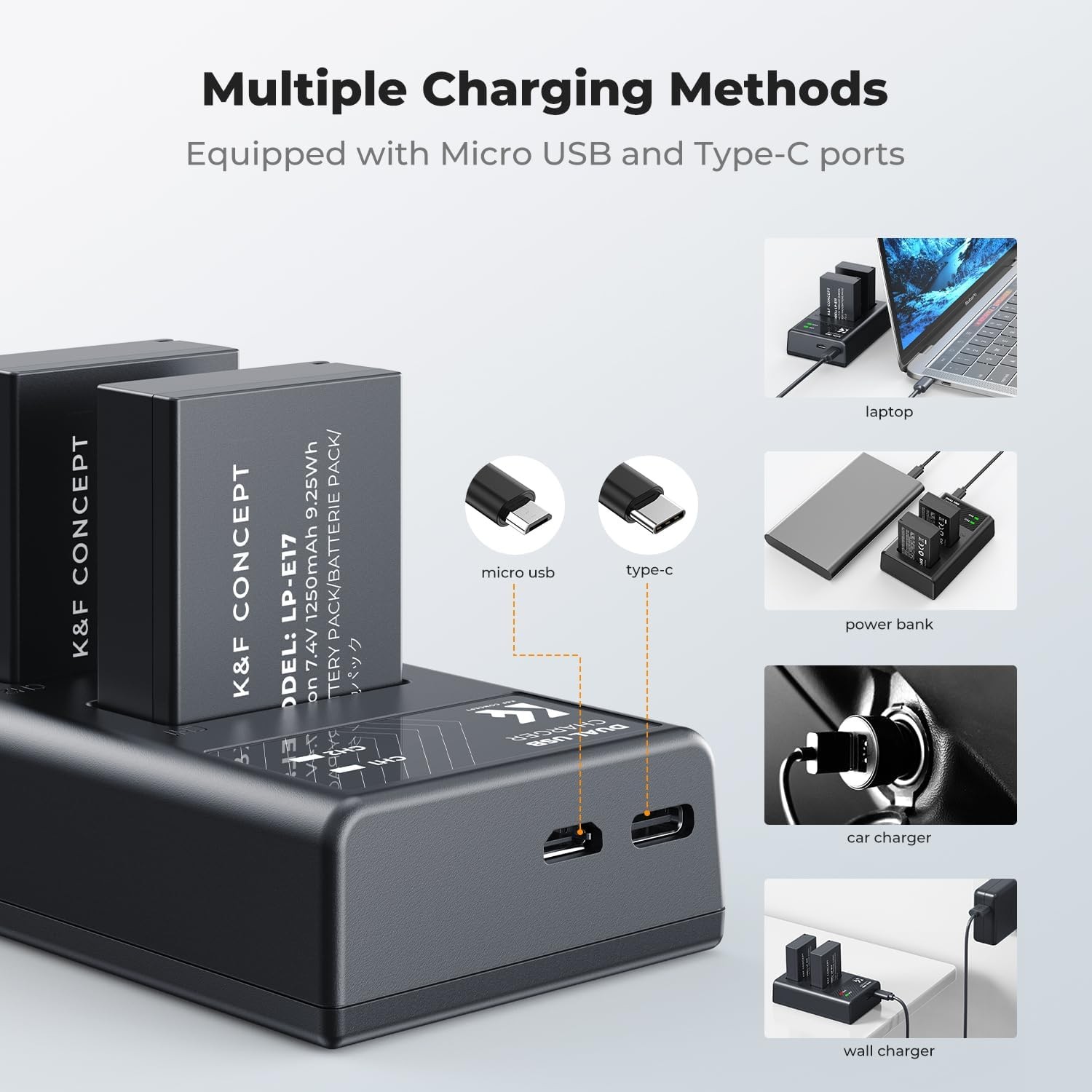 Aumenta el tiempo de uso de tu cámara Canon con el kit de baterías K&F Concept LP-E17 de 1250 mAh y el cargador doble. Este kit, fino y compacto, incluye dos baterías de alto rendimiento y un cargador doble USB-C/Micro B que permite cargar las baterías a la vez o por separado, lo que garantiza un flujo de trabajo eficiente y un rendimiento prolongado.