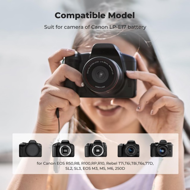 El kit de baterías y cargador K&F Concept LP-E17 está diseñado para que tus cámaras Canon funcionen durante más tiempo, lo que resulta ideal para sesiones fotográficas o grabaciones de vídeo prolongadas. Este kit incluye dos baterías recargables con una capacidad de 1250 mAh, que funcionan igual que las baterías originales y garantizan un suministro de energía estable y fiable. El cargador de dos ranuras es compatible con entradas USB-C y Micro B, lo que permite una carga flexible desde adaptadores de red, ordenadores portátiles o baterías externas, con la posibilidad de cargar dos baterías a la vez o por separado. Este kit compacto y portátil de cargador y baterías es ideal para fotógrafos que viajan. El paquete incluye 2 baterías LP-E17, 1 cargador de dos ranuras y 1 cable de carga USB-C, para que tengas todo lo necesario para la alimentación. Compatible con las cámaras Canon EOS R50, R10, Rebel T6/T6i/T6s y otras cámaras compatibles con LP-E17 (nota: es posible que en algunos modelos no se muestre la autonomía de la batería).