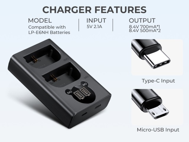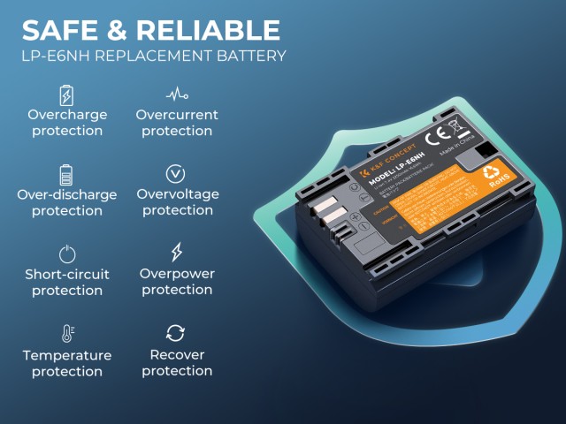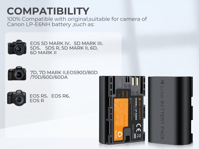 La batería LP-E6NH de K&F CONCEPT es compatible con las cámaras Canon que utilizan baterías LP-E6NH/LP-E6N/LP-E6, como por ejemplo la Canon EOS R5, EOS R6, EOS R, EOS 5D Mark IV, 5D Mark III, 5DS, 5DS R, 5D Mark II, 6D, 6D Mark II, 7D, 7D Mark II, 90D, 80D, 70D, 60D y 60Da (Nota: los modelos mencionados anteriormente son solo algunos de los disponibles).