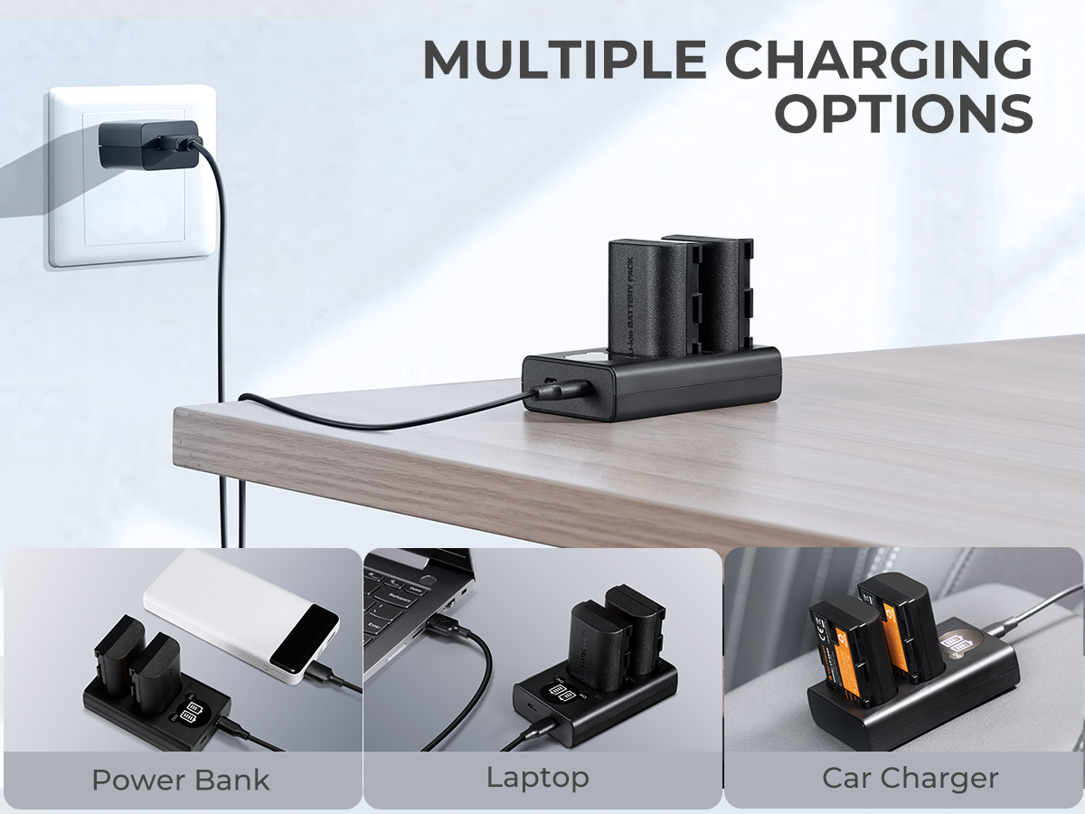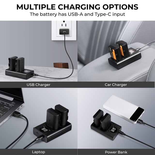 * 【Carga inteligente】 El cargador LCD dual muestra con precisión el estado de carga de la batería; el proceso de carga mediante un chip inteligente protege mejor la batería; el puerto de carga de dos ranuras puede cargar rápidamente dos baterías al mismo tiempo, lo que te ahorra mucho tiempo y es la mejor opción para viajar.