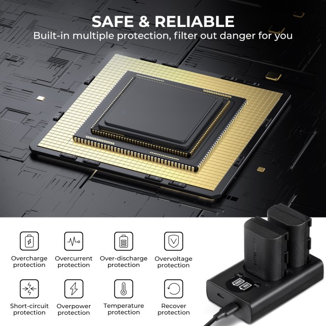 * 【Seguridad】 Utiliza baterías de alta calidad, cumple con estrictas normas de control, es seguro y fiable, lo que garantiza una carga y un uso seguros, con múltiples circuitos de protección que evitan la sobrecarga de la batería, protección contra sobrecorriente, protección contra descarga excesiva, protección contra sobretensión, protección contra cortocircuitos, protección contra sobrealimentación, protección contra altas temperaturas y protección contra la reactivación. - Tiempo de carga completa de dos baterías a la vez: aprox. 5,5 h - Temperatura de funcionamiento: menos de 60 °C.