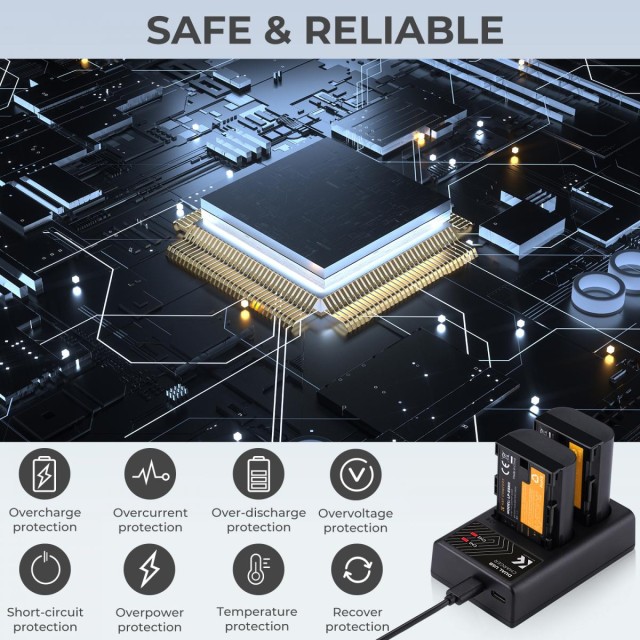 - * 【Protección inteligente de seguridad】 El cargador LCD dual muestra con precisión el estado de carga de la batería; el proceso de carga, gracias a chips inteligentes, protege mejor la batería contra sobrecargas, altas temperaturas, sobrecorriente, sobretensión y cortocircuitos