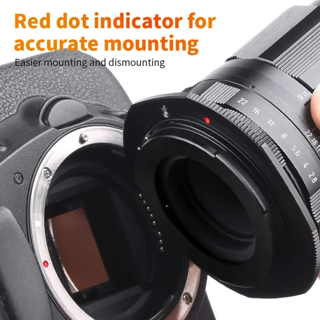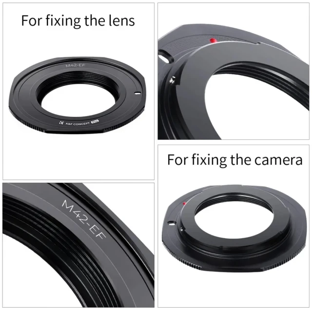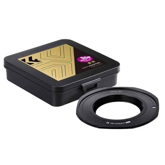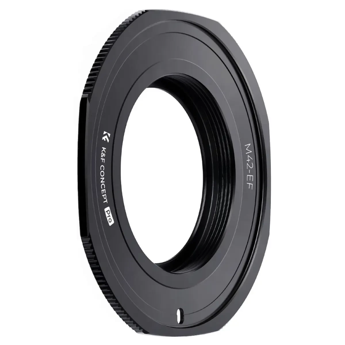 Adaptador K&F M42 a EF/EF-S para objetivos con montura M42 en cámaras Canon EOS EF y EF-S. Permite acoplar objetivos con montura M42 a cámaras con montura EF o EF-S.
