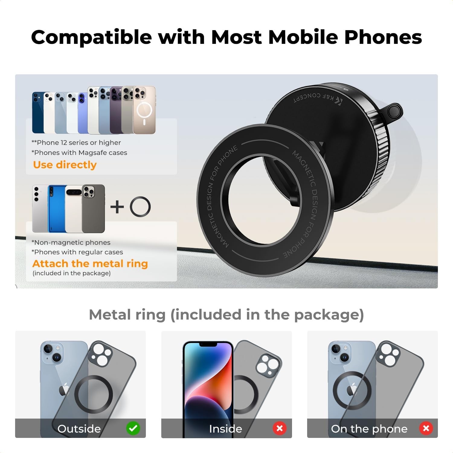 El soporte magnético para móvil para coche K&F CONCEPT combina una fuerza magnética avanzada con un sistema de ventosa de alto rendimiento, lo que ofrece una solución fiable y flexible para fijar el móvil. Gracias a su diseño magnético de doble anillo y a sus 20 imanes N52 de alto rendimiento, garantiza que tu teléfono permanezca firmemente en su sitio incluso en carreteras irregulares. La ventosa de nano-gel utiliza un mecanismo de sellado al vacío que se adhiere de forma segura a superficies lisas y se puede reutilizar simplemente lavándola con agua, sin que pierda su adherencia.