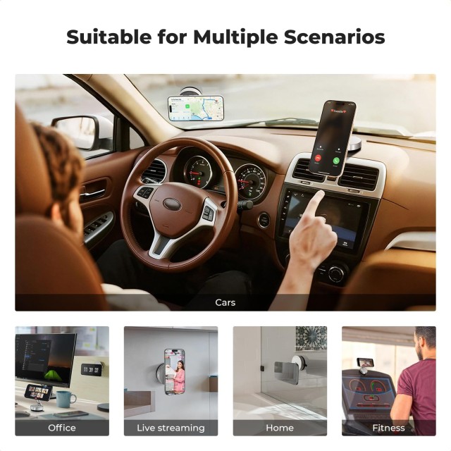 Gracias a la rotación de 360° en tres ejes —la base, la barra de conexión y el marco magnético—, este soporte permite un ajuste preciso del ángulo, y su estructura reforzada de aleación garantiza la estabilidad durante el uso. Su amplia superficie de sujeción funciona en diversas superficies lisas, incluyendo salpicaderos, cristales, paredes, mesas e incluso máquinas de gimnasio. La instalación es sencilla: presiona la ventosa contra la superficie y gira el mecanismo de fijación en el sentido de las agujas del reloj; a continuación, espera 12 horas para que alcance la máxima adherencia.