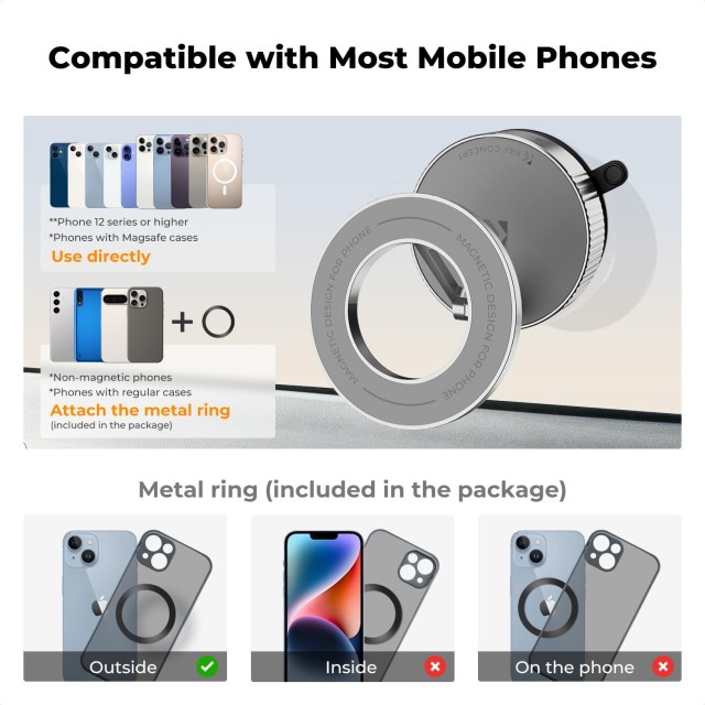 El soporte magnético para móvil para coche K&F CONCEPT (plateado) es un soporteuniversal giratorio de 360° con fijación por ventosa y resistentes anillos dobles con imanes N52. Es compacto, plegable y compatible con los iPhone MagSafe o con cualquier móvil mediante los anillos metálicos incluidos. Garantiza una sujeción segura en superficies lisas y salpicaderos, y ofrece un ajuste preciso en varios ejes.