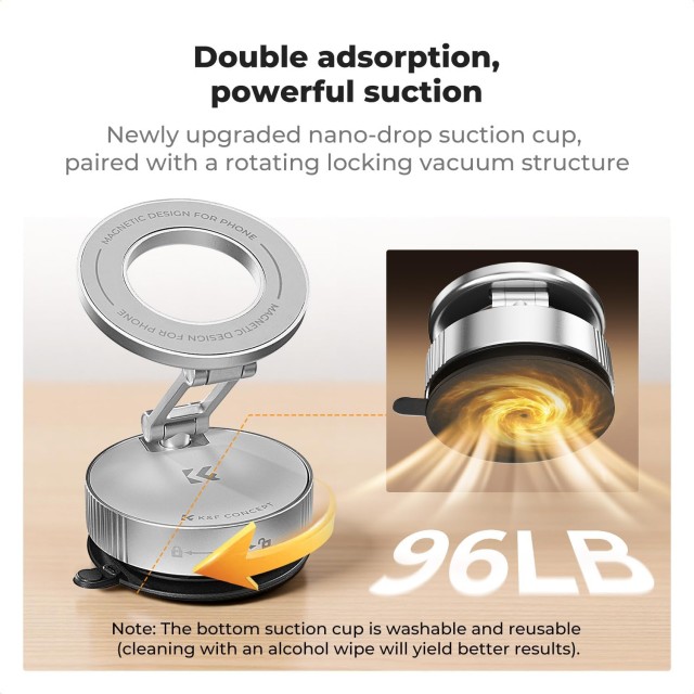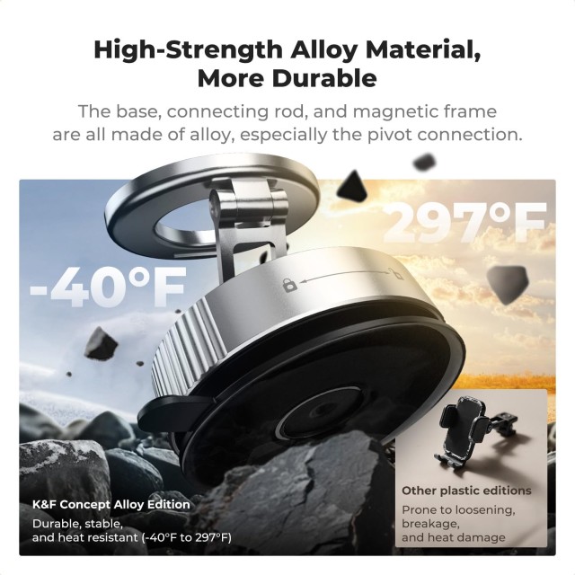 El soporte magnético para móvil para coche K&F CONCEPT (plateado) combina un potente magnetismo, una sujeción fiable y un ajuste en tres ejes, lo que lo convierte en un soporte seguro y versátil para el móvil, ideal para conducir, trabajar o para uso doméstico. Su diseño magnético con doble anillo y 20 imanes N52 de alta resistencia garantiza una sujeción segura de los teléfonos incluso al conducir por superficies irregulares. La base de succión cuenta con un diseño de nano-gel que permite su fijación y limpieza repetidas sin perder adherencia, y funciona en temperaturas extremas de -104 °F a 298 °F (-40 °C a 148 °C).