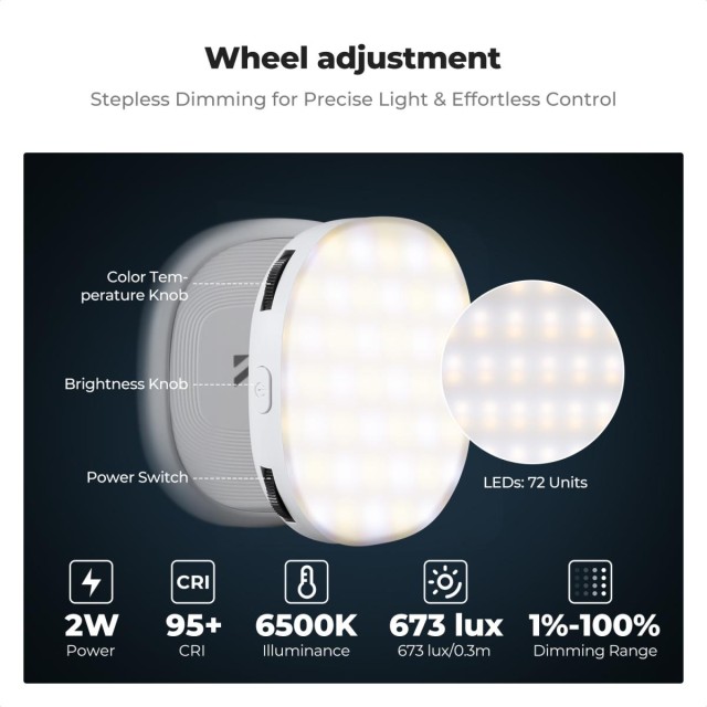 La luz proporciona una iluminación profesional y ofrece un rango de temperatura de color de 3000 K a 6500 K con un control continuo del brillo del 1 al 100 %, que se puede ajustar fácilmente mediante una rueda giratoria intuitiva. Con un índice CRI de 95+, un amplio ángulo de haz de 120° y 240 lux a 0,5 m, crea una iluminación suave y natural que realza los tonos de la piel y minimiza las sombras marcadas, lo que lo hace ideal para fotografiar en condiciones de poca luz y por la noche.