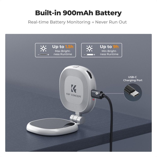 El espejo integrado de alta resolución añade una comodidad adicional, ya que te permite comprobar la composición, la postura o el maquillaje antes de grabar. La luz se alimenta mediante una batería recargable de 900 mAh y ofrece entre 1,5 y 9 horas de autonomía, dependiendo del ajuste de brillo. Se carga a través de un puerto USB-C universal y cuenta con un indicador LED de alimentación, por lo que nunca te sorprenderá una batería descargada.