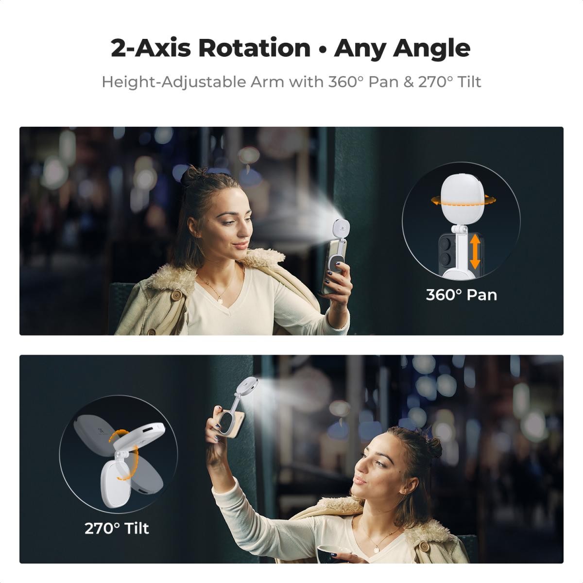 Su diseño plegable y extensible permite una colocación flexible con rotación completa hacia delante y hacia atrás, lo que te ofrece un control creativo total sobre los ángulos y la distancia de la iluminación. Cuando está plegada, la luz es tan compacta como una polvera, mide solo 6,4 × 7,5 × 2,3 cm y pesa tan solo 93 g, lo que la hace ideal para viajar, llevarla a diario y hacer fotos sobre la marcha.