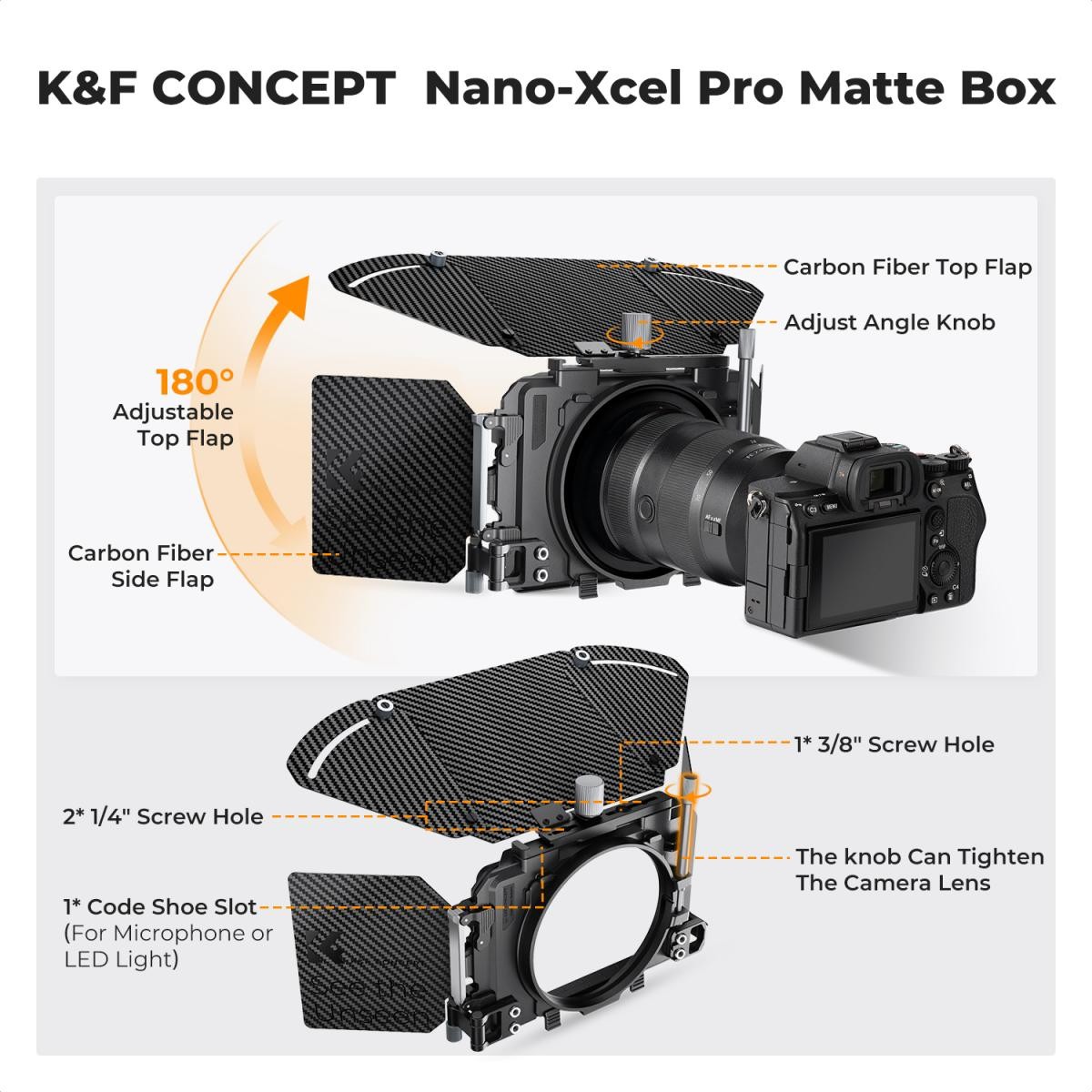 Juego de matte box con 2 monturas para objetivos y un adaptador de 67/72/77/82/95 mm, apto para filtros cuadrados de 4x5,65". El matte box Pro está diseñado para cámaras sin espejo, con el fin de evitar los destellos y los reflejos de la luz solar u otras fuentes de luz. La cubierta superior se abre 180° y sus alas laterales se extienden 40°. Nota: La cubierta superior no se puede cerrar si hay más de 2 soportes de filtro instalados.