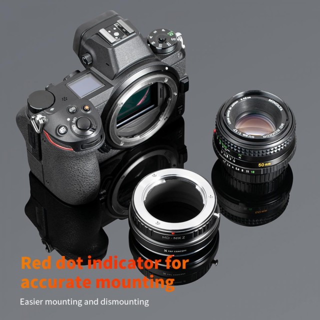 El adaptador de objetivo K&F Concept Minolta MD/MC a Nikon Z permite utilizar los objetivos clásicos Minolta MD y MC en cámaras Nikon con montura Z, como la Z6 y la Z7. Está fabricado en cobre liso y resistente, admite el enfoque totalmente manual y el enfoque al infinito, y cuenta con un punto rojo para facilitar su instalación.