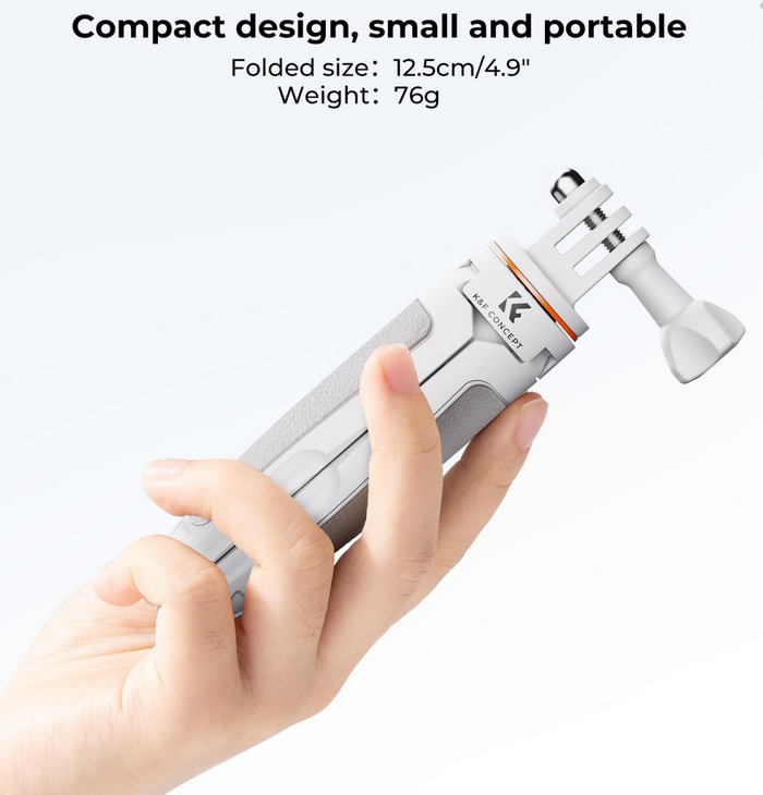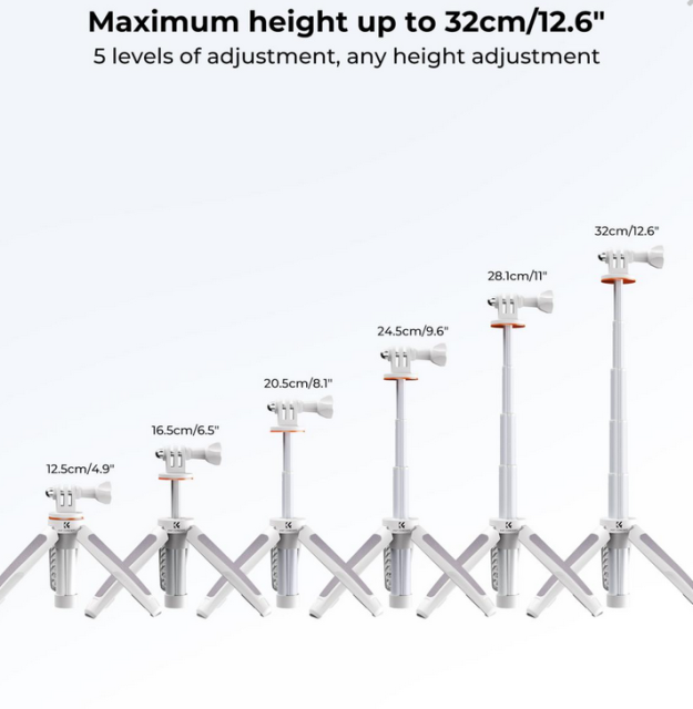 El trípode para teléfonos inteligentes K&F MS03, en color naranja y gris, es una solución versátil y portátil para tus necesidades fotográficas y de vídeo. Gracias a su altura máxima de 32 cm y al ajuste de las patas en 5 secciones, puedes adaptarlo fácilmente a la altura deseada. El cabezal del trípode soporta una carga de hasta 2 kg, por lo que es adecuado para dispositivos GoPro, DJI Osmo Action e Insta 360. Su anillo de goma amortiguador integrado garantiza estabilidad y resistencia, mientras que la estructura reforzada y la base de silicona antideslizante en la parte inferior proporcionan un mejor apoyo. Este trípode pesa solo 67 g, es fácil de transportar e ideal para viajar y grabar en la naturaleza.