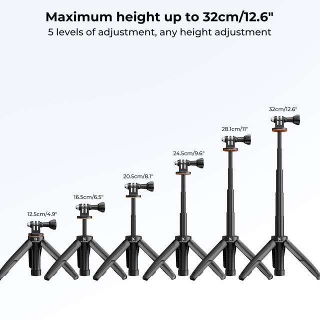 Soportes para cámaras de acción. Soporte de mesa para palo selfie (tamaño pequeño) para GoPro, Action y Insta, en negro y naranja. Este pequeño trípode para teléfono cuenta con una estructura rígida reforzada y silicona antideslizante. El tubo ajustado incorpora un anillo de goma amortiguador, lo que hace que todo el tubo extendido sea más estable y resistente. Base en la parte inferior para un apoyo más estable.