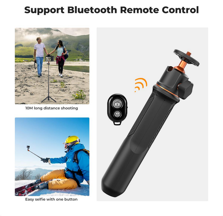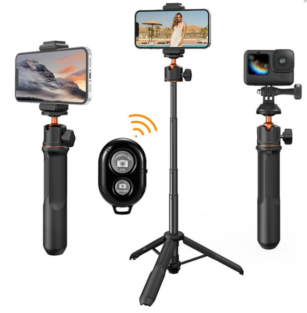 El trípode K&F MS11 es una solución versátil y ligera diseñada para usuarios de teléfonos móviles y cámaras de acción. Cuenta con una abrazadera para teléfonos móviles compatible con dispositivos de hasta 91 mm de ancho, por lo que es ideal para grabar vídeos y retransmitir. El adaptador GoPro incluido amplía su uso a cámaras de acción como GoPro, DJI Osmo Action y dispositivos Insta 360. La parte superior del trípode cuenta con una interfaz de 1/4 de pulgada que permite conectarlo a diversos dispositivos para satisfacer las más variadas necesidades de grabación. Su anillo de goma integrado para amortiguar los golpes y su estructura robusta y reforzada garantizan la estabilidad, mientras que la base de silicona antideslizante de la parte inferior proporciona un apoyo seguro. Este trípode pesa solo 147 g, es muy portátil e ideal para viajar y hacer fotos en la naturaleza. El mando a distancia Bluetooth incluido se empareja rápidamente sin contraseña y permite hacer fotos o grabar vídeos en un radio de 10 metros, con una autonomía de hasta 10 horas.
