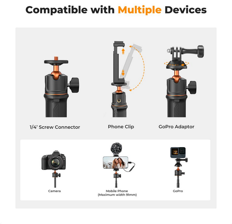 El trípode K&F MS11 es una solución versátil y ligera diseñada para usuarios de teléfonos móviles y cámaras de acción. Cuenta con una abrazadera para teléfonos móviles compatible con dispositivos de hasta 91 mm de ancho, por lo que es ideal para grabar vídeos y retransmitir. El adaptador GoPro incluido amplía su uso a cámaras de acción como GoPro, DJI Osmo…