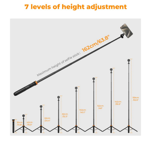 El trípode para teléfonos K&F MS19 ofrece una versatilidad excepcional en cuanto a altura, con una extensión máxima de 162 cm y un ajuste de las patas en 7 secciones, lo que permite configurar la altura ideal para cualquier toma. El trípode está diseñado para un uso cómodo y cuenta con una estructura de instalación magnética, gracias a la cual la conexión entre el trípode, el palo selfie y el teléfono móvil es rápida y sin complicaciones. Este trípode es compatible con una amplia gama de dispositivos, incluidos los modelos de iPhone desde el 12 mini hasta el último 15 Pro Max. El soporte magnético garantiza una cobertura completa de las tomas, por lo que es ideal para capturar paisajes, retratos o escenas deportivas. El trípode, que integra un control remoto Bluetooth, facilita la captura fluida de selfies y fotos durante los viajes, y cuenta con un control de un solo botón y un diseño seguro contra pérdidas, con una autonomía de hasta 10 horas de funcionamiento continuo. La estructura reforzada del trípode y las almohadillas de silicona antideslizantes en la base aumentan la estabilidad, mientras que los anillos de goma integrados en el tubo de las patas, que amortiguan los golpes, garantizan una mayor resistencia y estabilidad.
