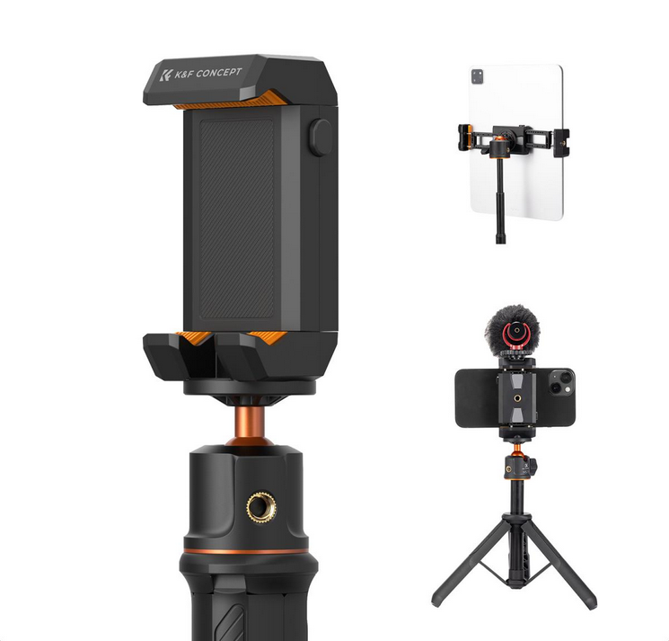 El K&F MS20 es un soporte versátil 2 en 1 para teléfonos y tabletas, diseñado para ofrecer comodidad y flexibilidad. Permite fijar de forma segura tanto el teléfono móvil como la tableta al mismo tiempo, lo que facilita el ajuste de la configuración con un solo clic y un movimiento. El soporte está equipado con una interfaz de zapata fría para conectar diversos accesorios fotográficos, como micrófonos y luces de relleno. Gracias a su anchura ajustable entre 6 y 22 cm y a varios orificios de 1/4" para tornillos que permiten acoplar un trípode o un dispositivo, ofrece un soporte robusto y gran adaptabilidad. Su diseño compacto, su estructura ligera y su base hueca garantizan un almacenamiento sencillo, compatibilidad con la carga y protección del dispositivo.