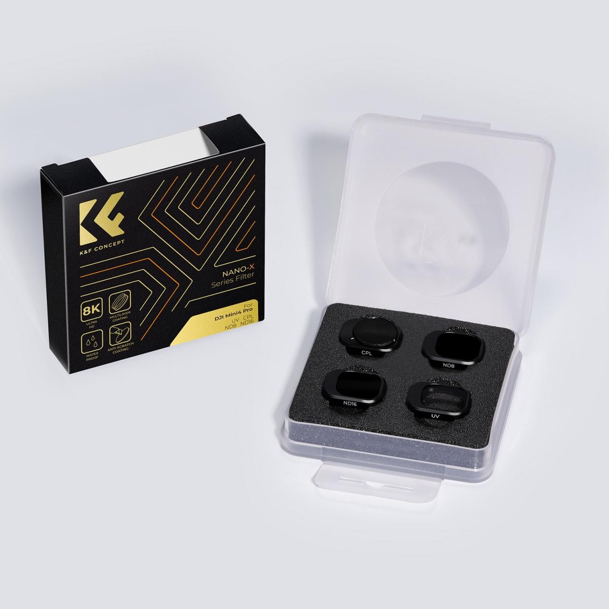 Este nuevo juego de 4 filtros de K&F Concept está especialmente diseñado para la DJI Mini 4 Pro y ofrece protección para el objetivo, mejora del color y un efecto de reducción de la luz. Cada filtro, fabricado con cristal óptico AGC importado, no afecta a la calidad de la imagen y garantiza la reproducción fiel de los colores. El filtro, con un tratamiento superficial múltiple, reduce al máximo el deslumbramiento y los reflejos; es resistente al agua, a los arañazos, al polvo y a la grasa, y protege el objetivo de tu cámara DJI Mini 4 Pro de los destellos omnipresentes.