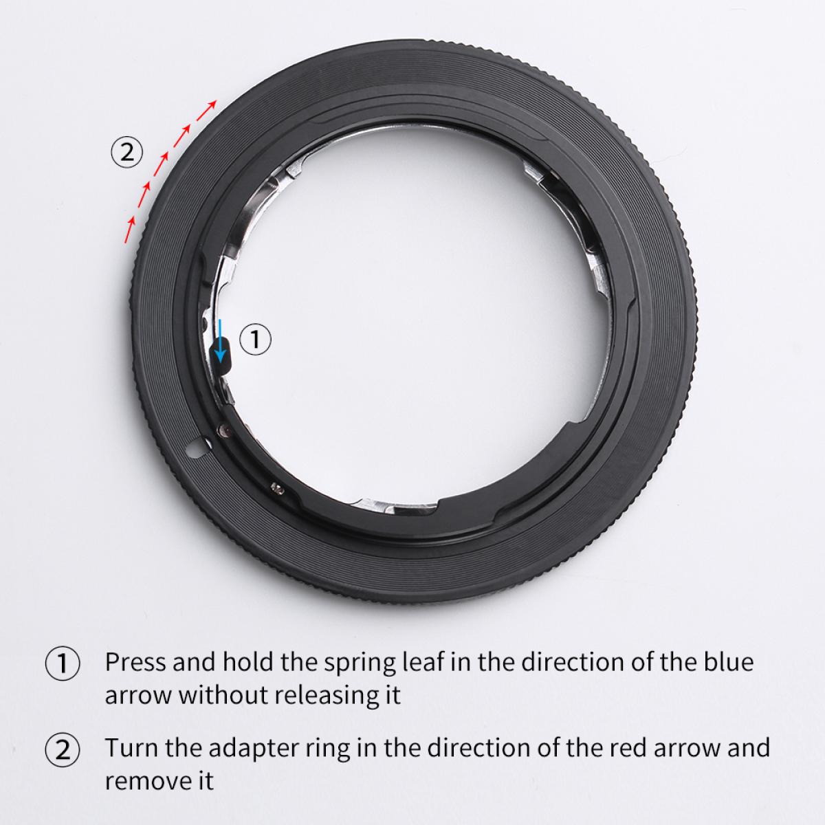 Aunque el objetivo encaja físicamente, ni el diafragma automático, ni el enfoque automático, ni ninguna otra función funcionarán al utilizar este adaptador. El anillo del adaptador no tiene contactos eléctricos. El funcionamiento totalmente manual, el enfoque manual y el ajuste manual del diafragma se pueden lograr con la exposición manual del cuerpo y la prioridad de diafragma. En este caso, será necesario utilizar el «modo de reducción de apertura» durante la medición, ya que el objetivo no permite el control de la apertura desde el cuerpo de la cámara. Puede fotografiar en modo manual o en modo de prioridad de apertura. Antes de utilizarlo, configure la cámara en el menú: «Fotografiar sin objetivo».