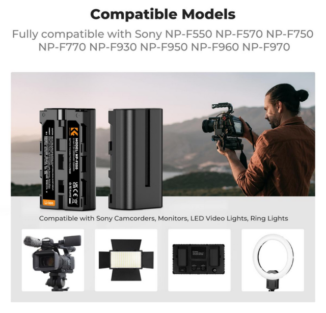 Amplia compatibilidad: Estas baterías son compatibles con una amplia gama de videocámaras y dispositivos Sony que utilizan baterías NP-F550, F570, F750, F770, F930, F950, F960 y F970, por lo que resultan versátiles para diversos entornos.