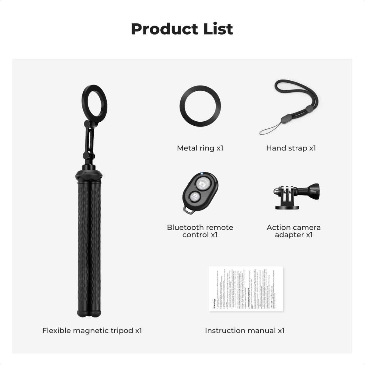 El soporte magnético para móvil Octopus Tripod incluye una correa magnética, un mando a distancia Bluetooth, un cordón para el móvil y un adaptador GoPro MS36. Cuenta con un sistema de fijación rápida magnética de 1 segundo que proporciona una gran fuerza de sujeción. La banda elástica de aluminio integrada se puede moldear a voluntad y enrollar fácilmente alrededor de diversos objetos.