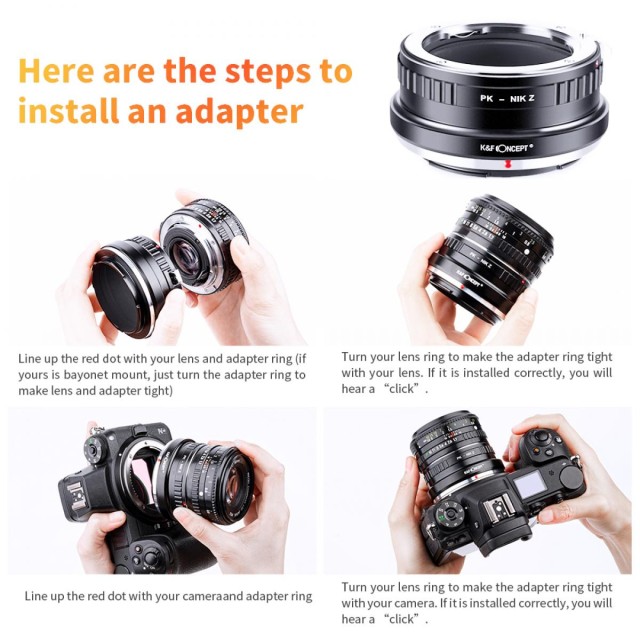 El adaptador de objetivo K&F Concept Pentax K a Nikon Z permite a los fotógrafos acoplar objetivos Pentax PK clásicos a las cámaras Nikon de la serie Z, incluidos los modelos Z6 y Z7. El adaptador está fabricado en cobre de alta calidad y garantiza un acoplamiento suave y preciso del objetivo, con una larga vida útil. El control totalmente manual permite un control absoluto sobre la apertura y el enfoque, al tiempo que mantiene el enfoque en el infinito para obtener resultados nítidos a gran distancia. El punto de alineación rojo garantiza una instalación sencilla y un cambio rápido de objetivos. Si la cámara avisa de que el objetivo no está instalado, ajuste la configuración «disparar el obturador sin objetivo» en el menú de la cámara. Este adaptador lleva el carácter de los objetivos Pentax K a la moderna plataforma sin espejo de Nikon.