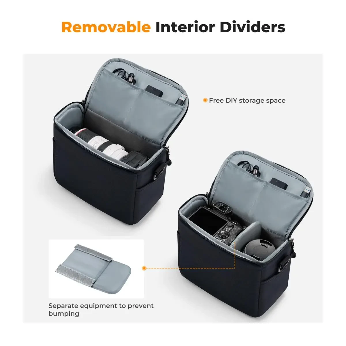 • Multifuncional: incluye un separador acolchado extraíble para personalizar el espacio de almacenamiento, lo que mantiene la cámara y otros objetos separados y protegidos. Al retirar los separadores, puedes convertirla en un elegante bolso de hombro para el uso diario.